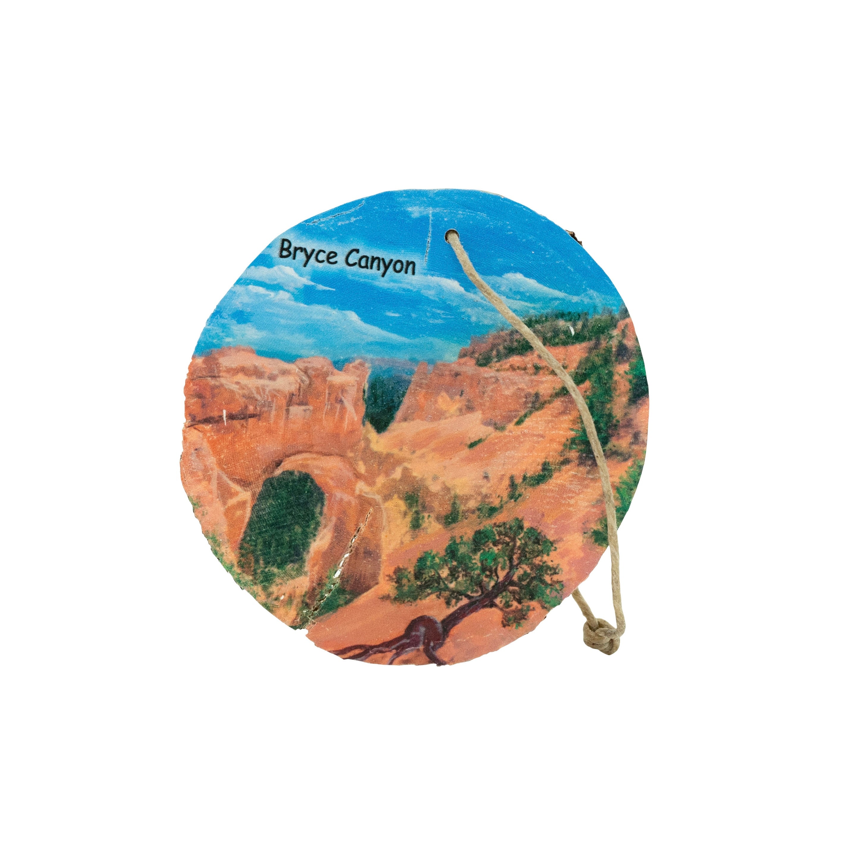 This handcrafted wooden ornament showcases a stunning painting of the Natural Bridge at Bryce Canyon, a striking rock formation carved by time. The intricate artwork brings the landscape to life, making it a perfect memento for those who cherish Utah’s natural beauty.