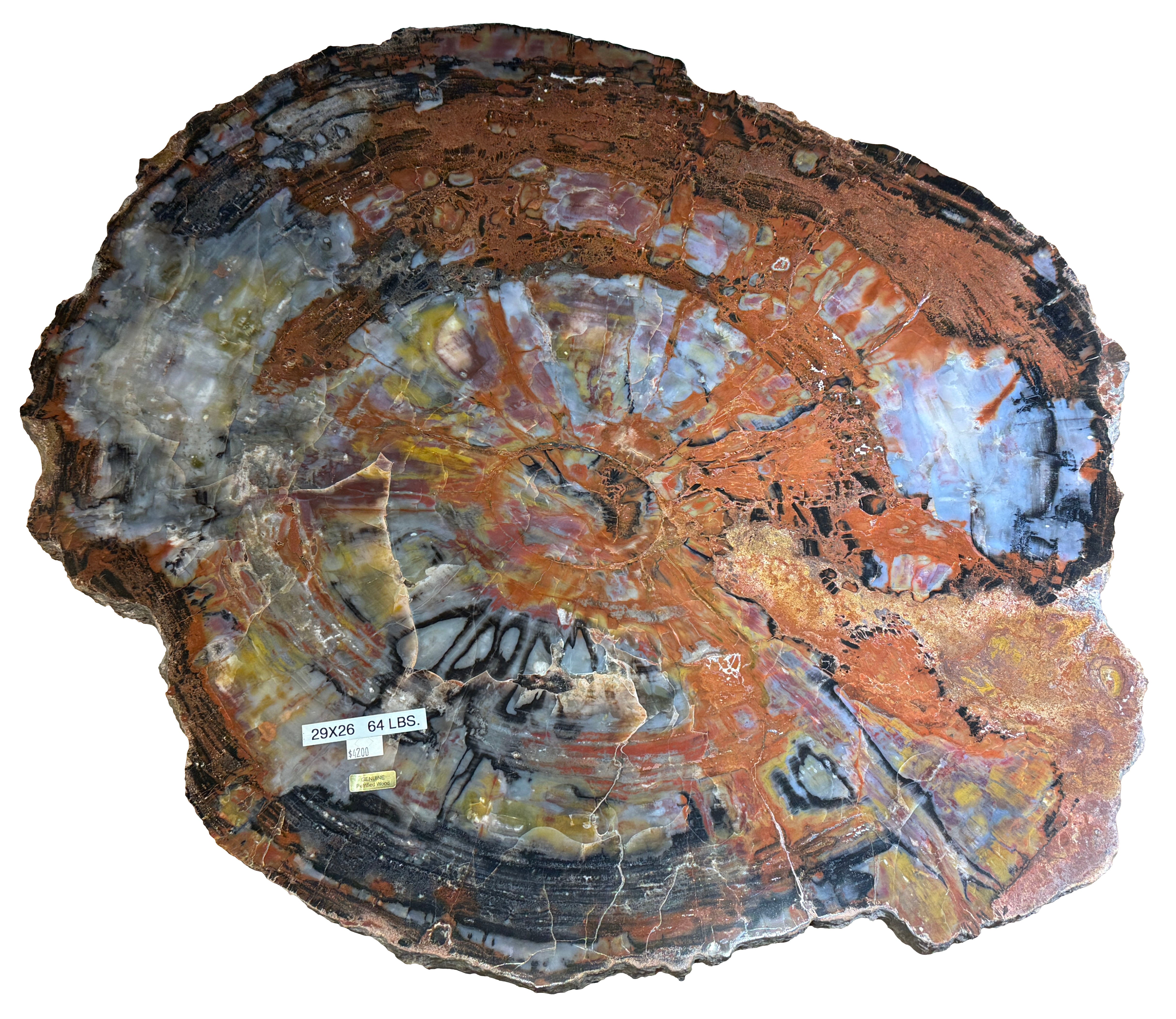 Round slab full of iron oxides covering the silica with manganese oxides highlighting the fading rings of the tree.