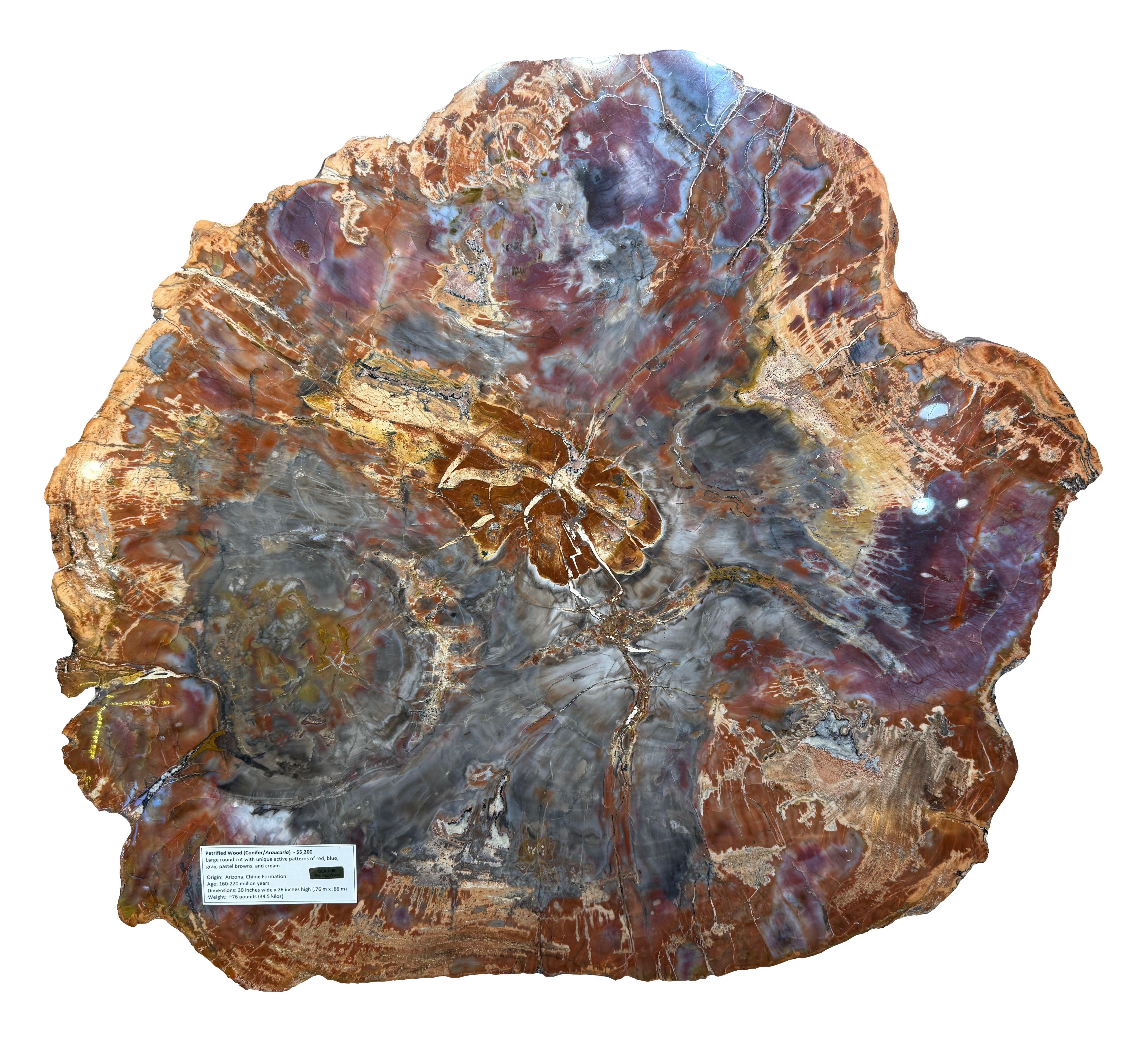 Round Slab cut with unique active patterns of red, blue, gray, pastel browns and cream.Origin: Arizona Chinle Formation Age: 225 - 213 million years agoSize: 30 inches x 26 inches