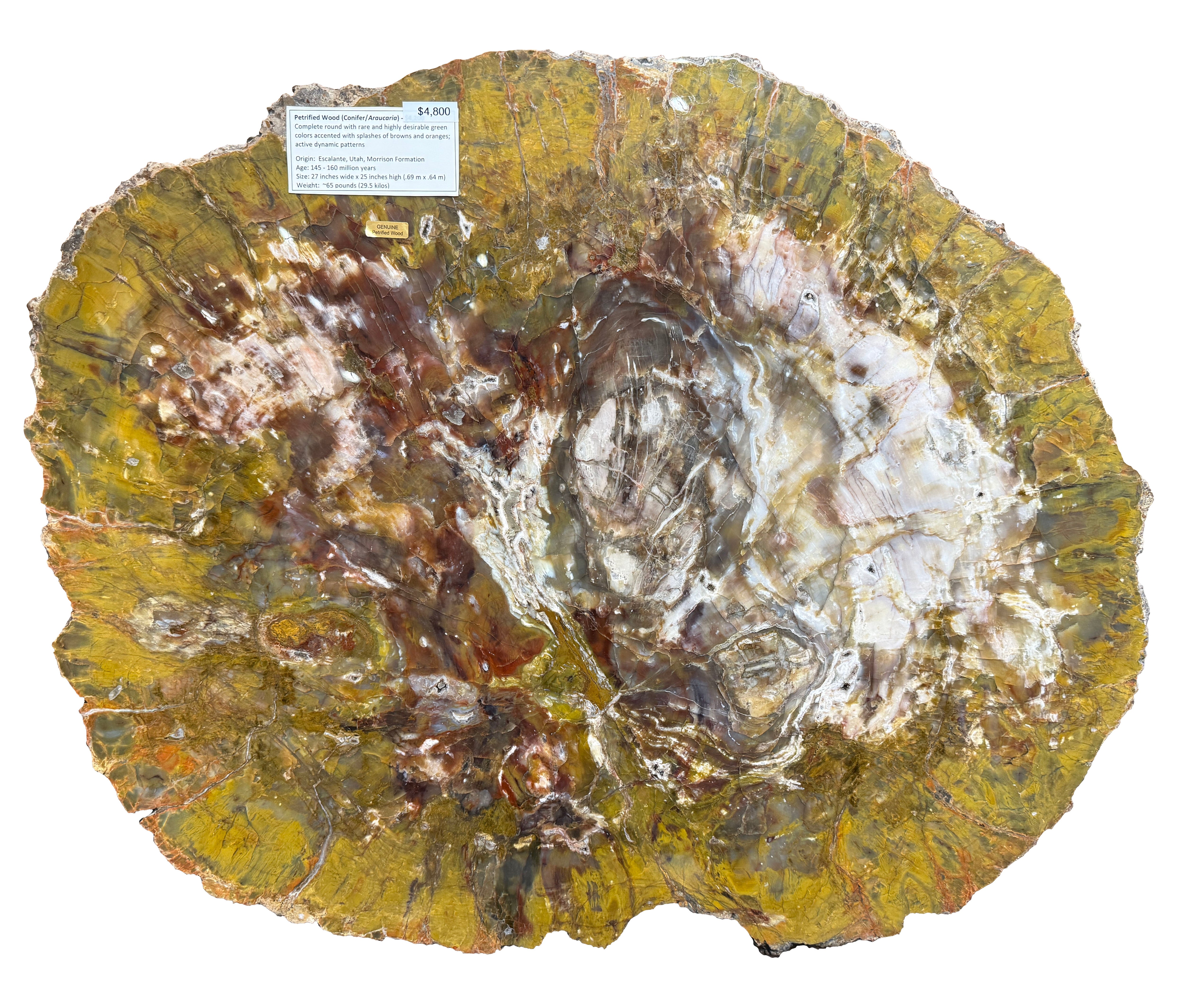 Round Slab with rare and highly desirable green colors with splashes of browns and oranges; active dynamic patterns.