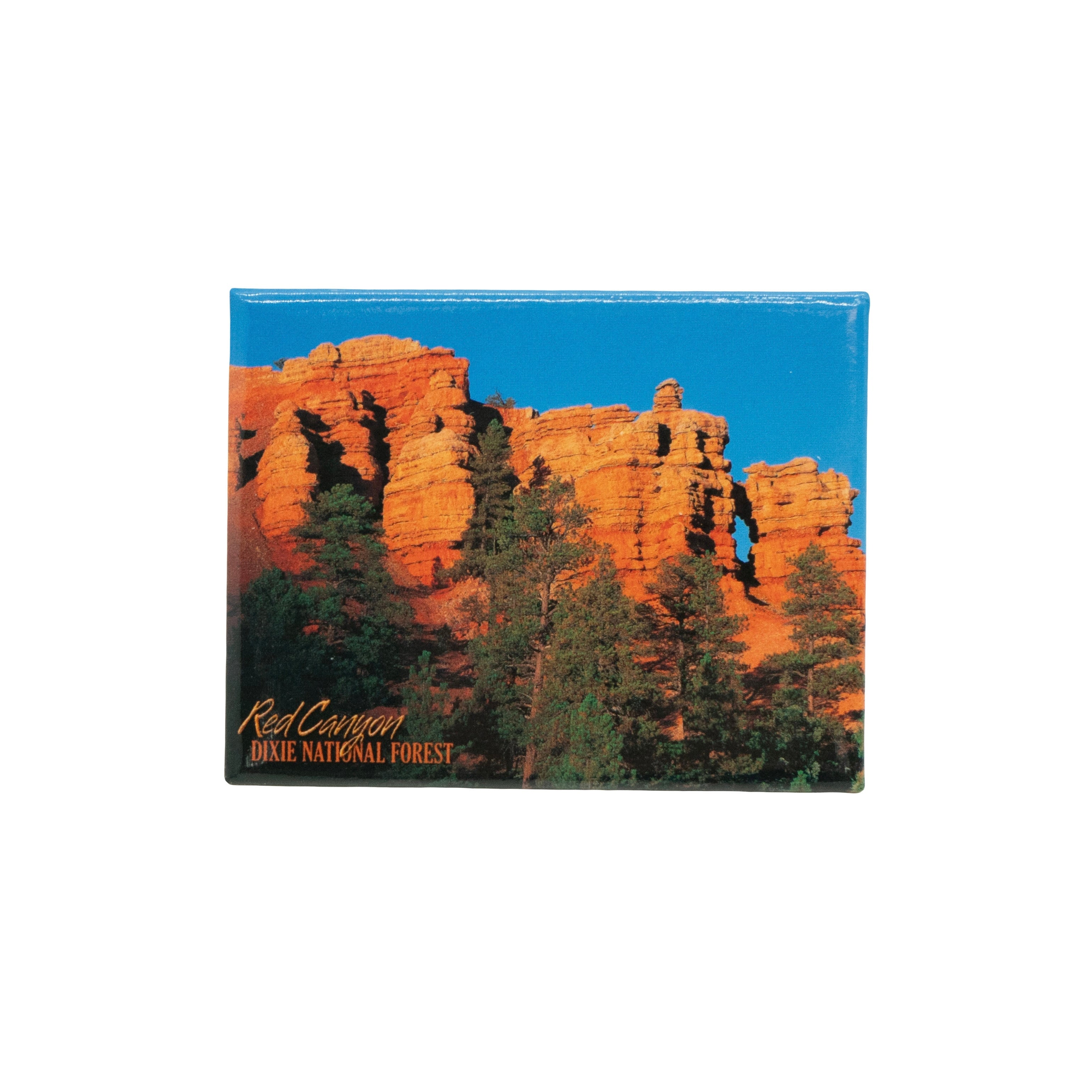 Showcasing the vibrant red rock formations of the Red Canyon in Dixie National Forest, this magnet features a striking scene of hoodoos, offering a lasting reminder of this unique and picturesque landscape.